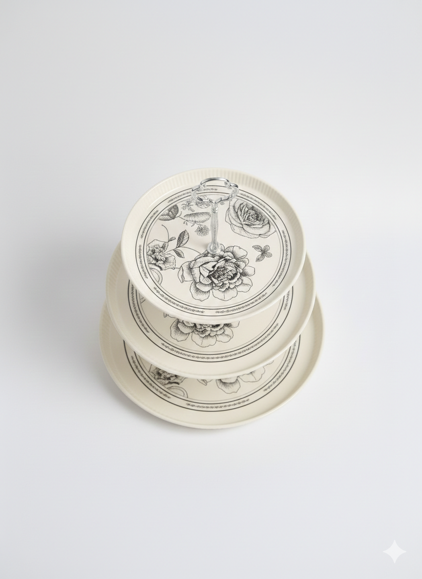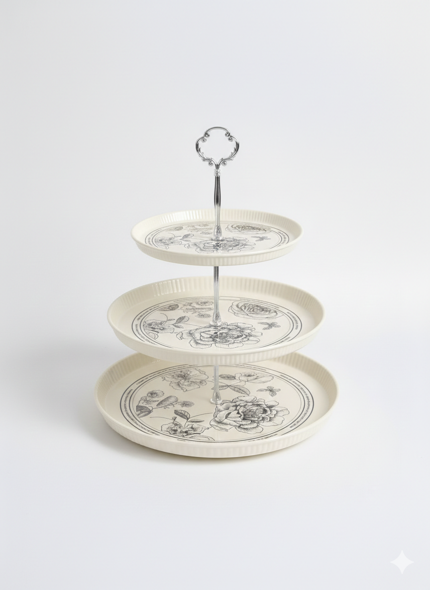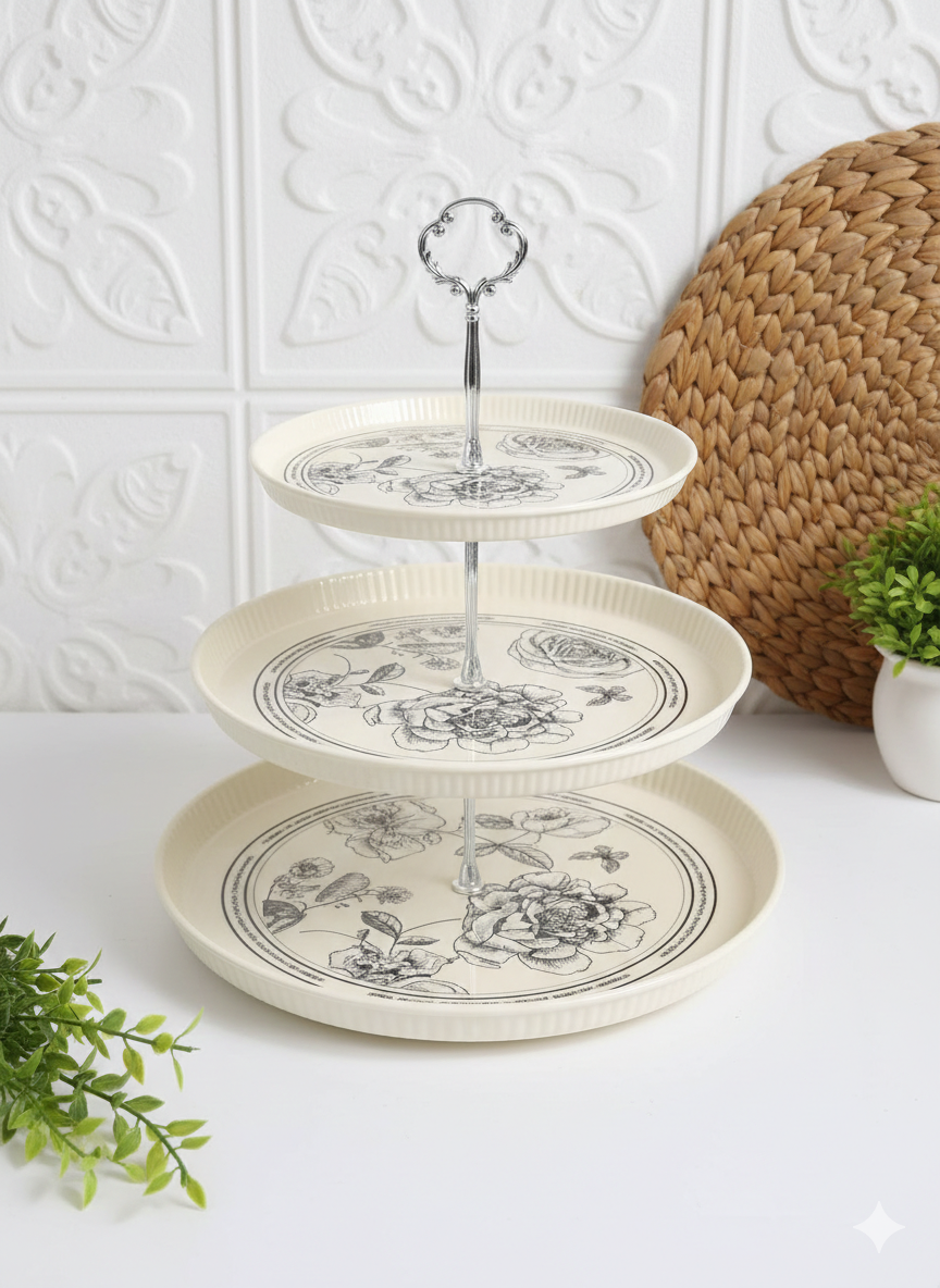 شيّالة كحك 3 أدوار من AtoZ بتصميم مودرن ورسومات أنيقة، مثالية لتقديم الكحك والحلويات والضيافة، موفّرة للمساحة وثابتة بحامل معدني قوي.