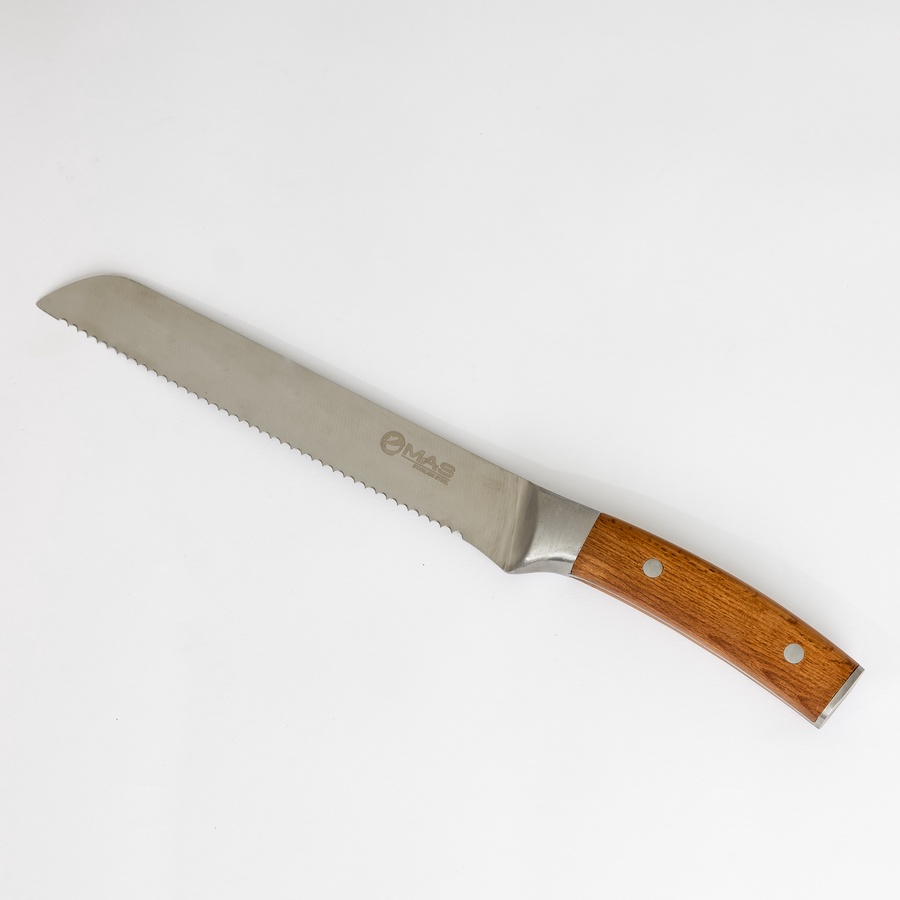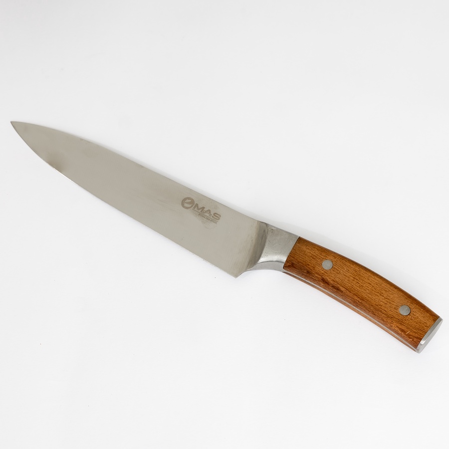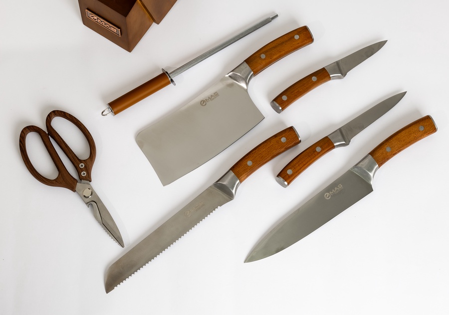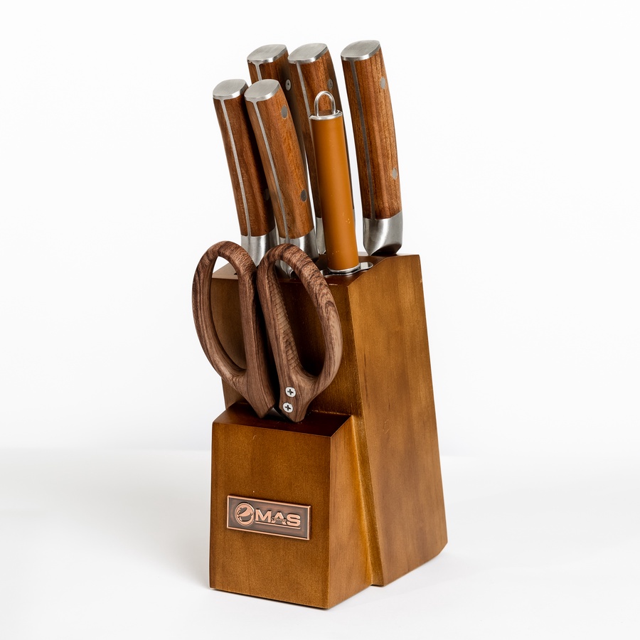 طقم سكاكين MAS الألماني 8 قطع (5 سكاكين + مقص + مسن + حامل خشب). تصميم أنيق وجودة عالية لاحتراف التقطيع. متوفر الآن على ATOZ.