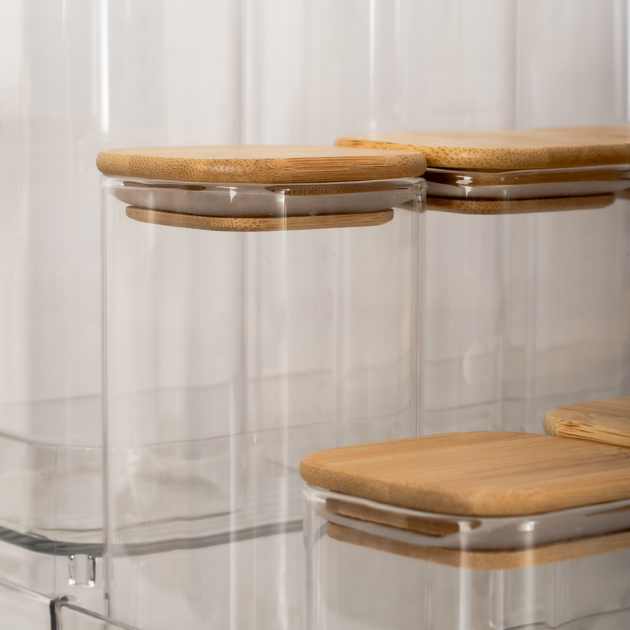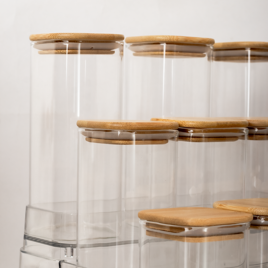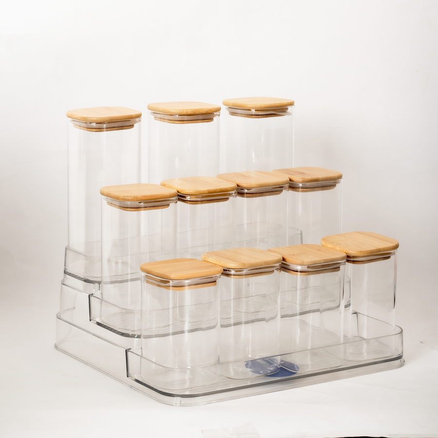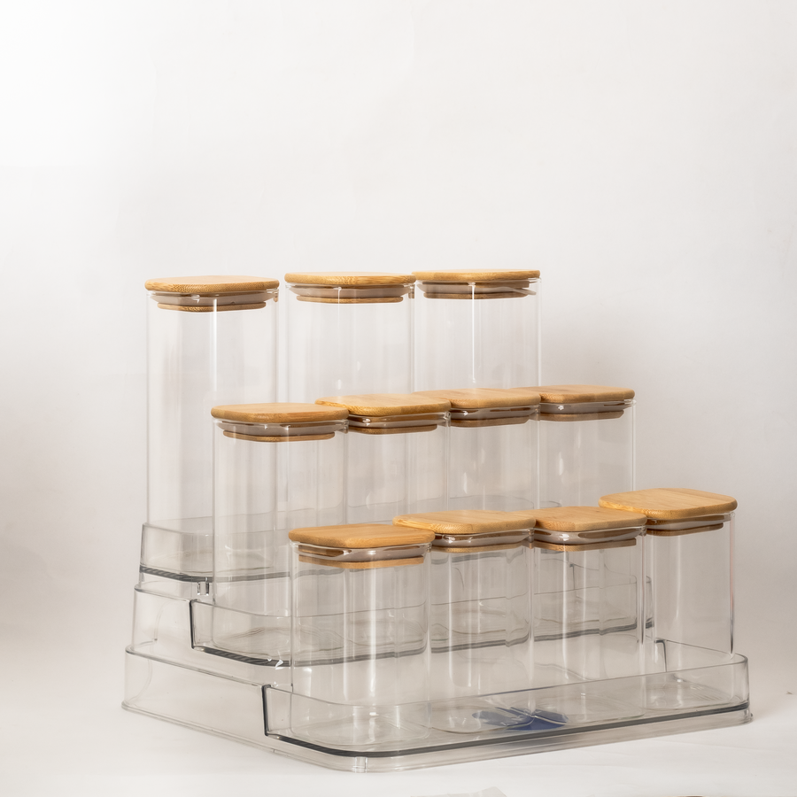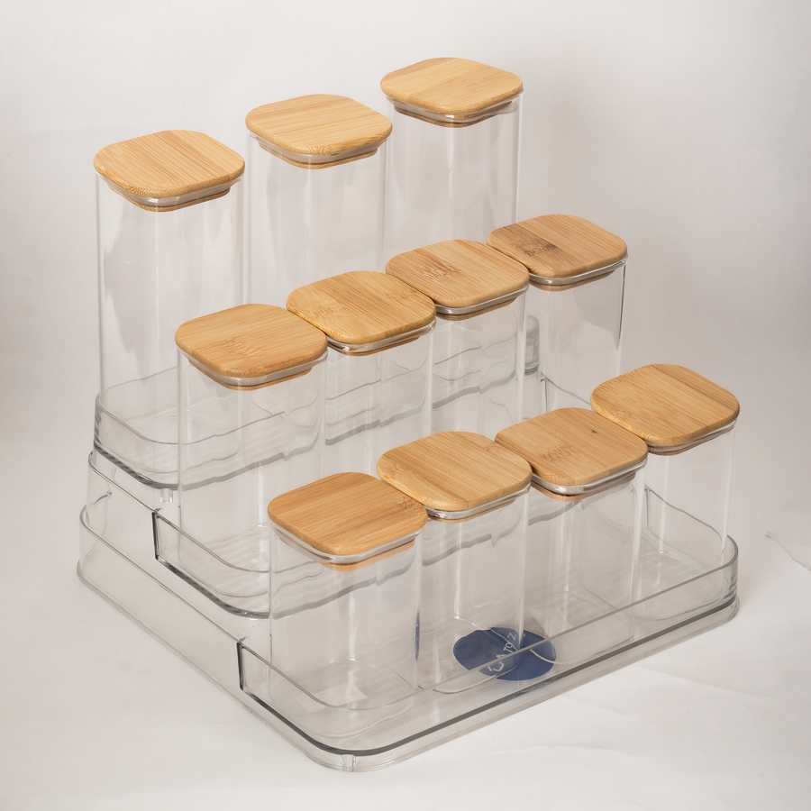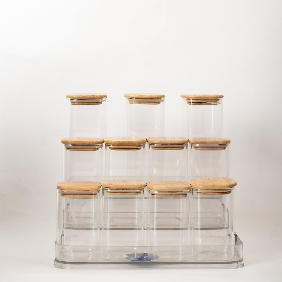 الطقم بيضم 11 برطمان زجاجي شفاف بغطاء بامبو طبيعي محكم الغلق، علشان يحافظ على النكهة والانتعاش أطول فترة ممكنة. كمان معاهم رف شفاف لتوفير المساحة وملصقات توابل تساعدك تحددي كل حاجة بسهولة.