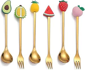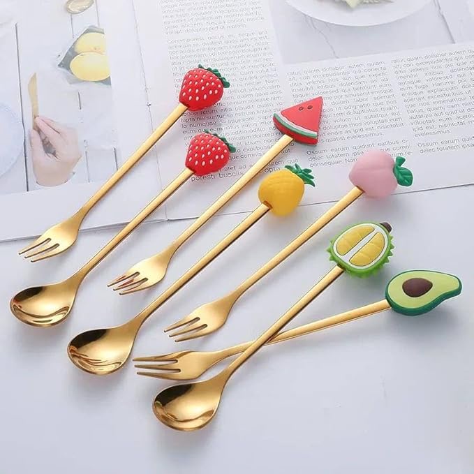 طقم معالق وشوك دهبي من AtoZ، ستانلس ستيل متين ولمسة فواكه ملونة شيك. عملي، سهل التنضيف، ومثالي للهدايا أو العزومات.