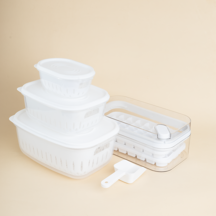 عرض التوفير من AtoZ: علبة تلج مبتكرة + طقم علب مصفاة شفافة بأحجام عملية. تصميم أنيق يحافظ على الطعام طازج وينظم مطبخك بسهولة.