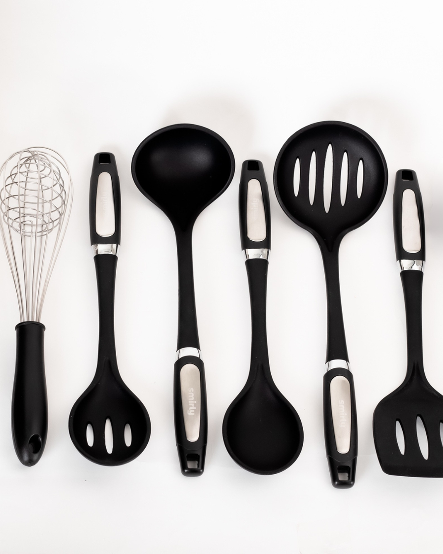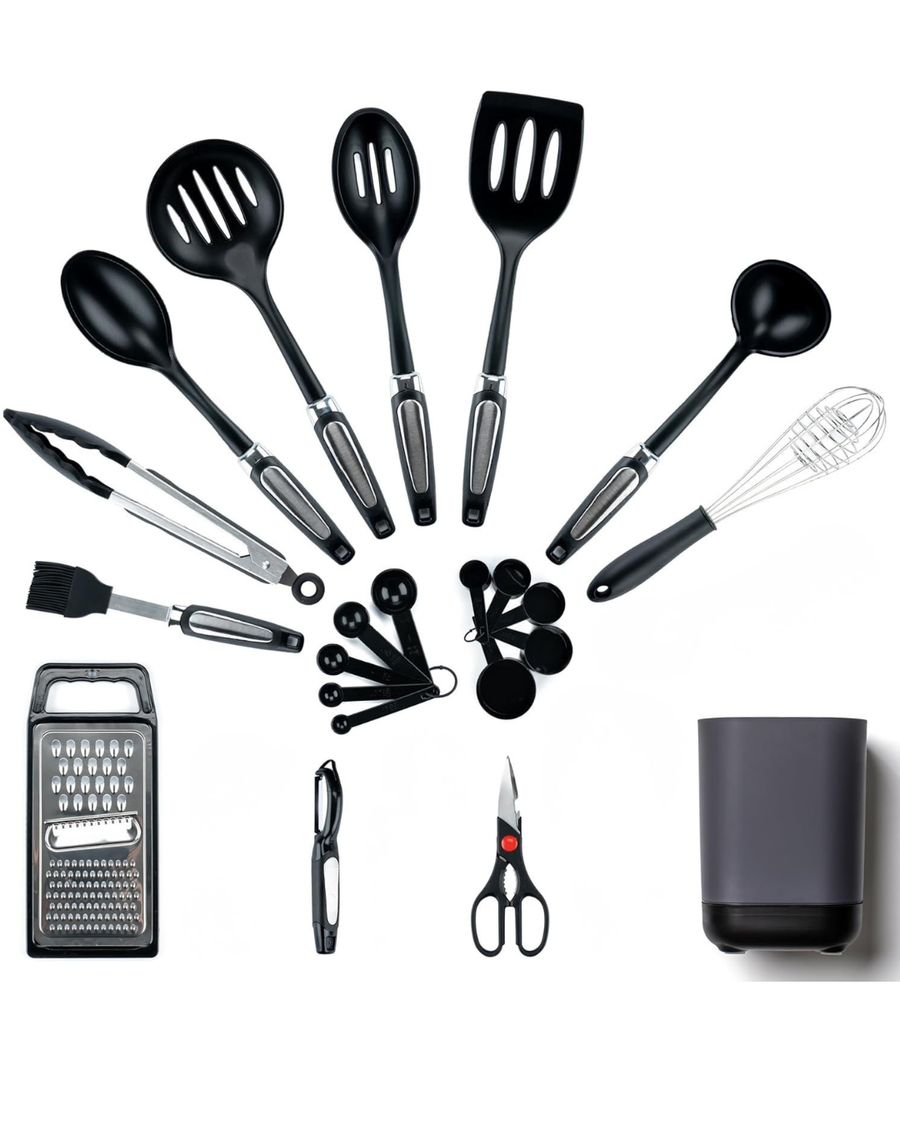 طقم توزيع سيليكون 32 قطعة أسود من AtoZ، خامات متينة مقاومة للحرارة، منظم مع حامل وخطافات، سهل التنضيف – مثالي لتنظيم مطبخك أو كهدية عملية.