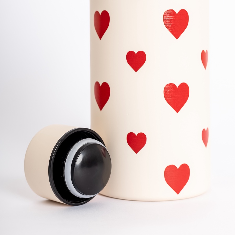 خلي مشروبك بدرجته المثالية طول اليوم مع ترمس Love Hearts بتصميم القلوب الأحمر اللطيف، والمصنوع من خامات ممتازة تجمع بين الأناقة والعملية. مناسب لكل الأوقات والمشروبات، وسهل تحمليه معاكي في أي مكان.
