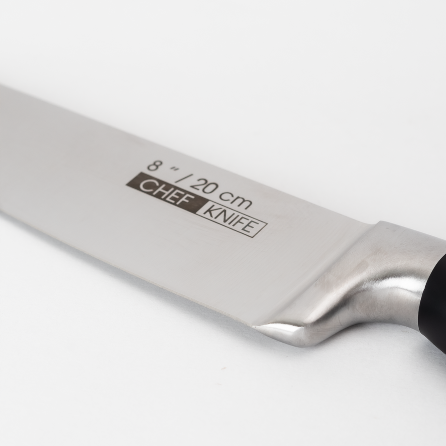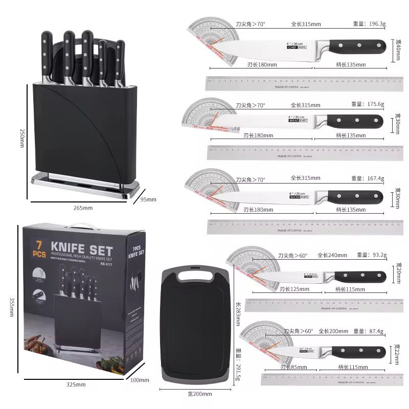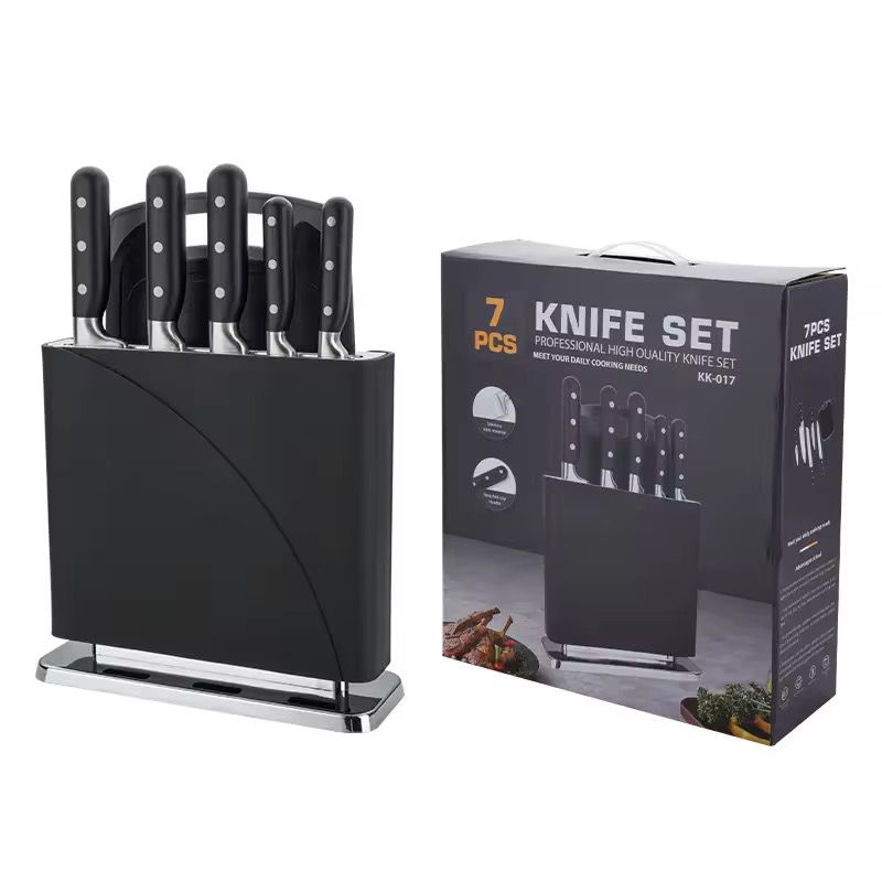 الطقم حاد جدًا وبيقطع اللحمة والخضار بسهولة من غير أي مجهود. الستاند الأسود شكله شيك وبيخلي مطبخي منظم.