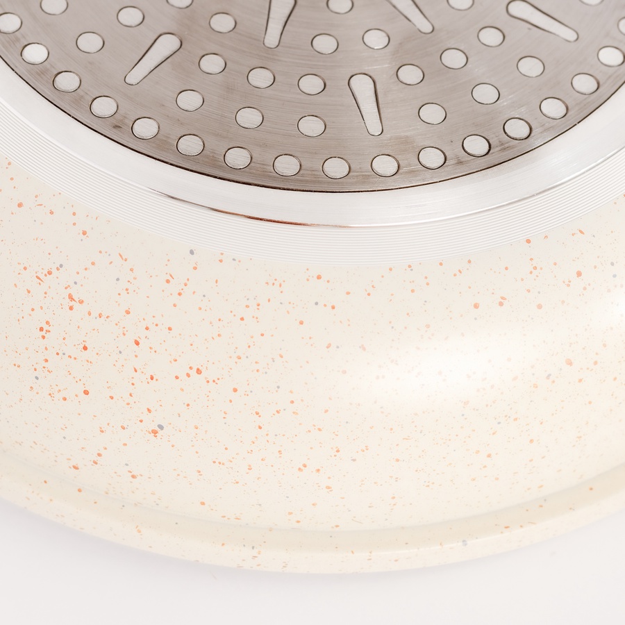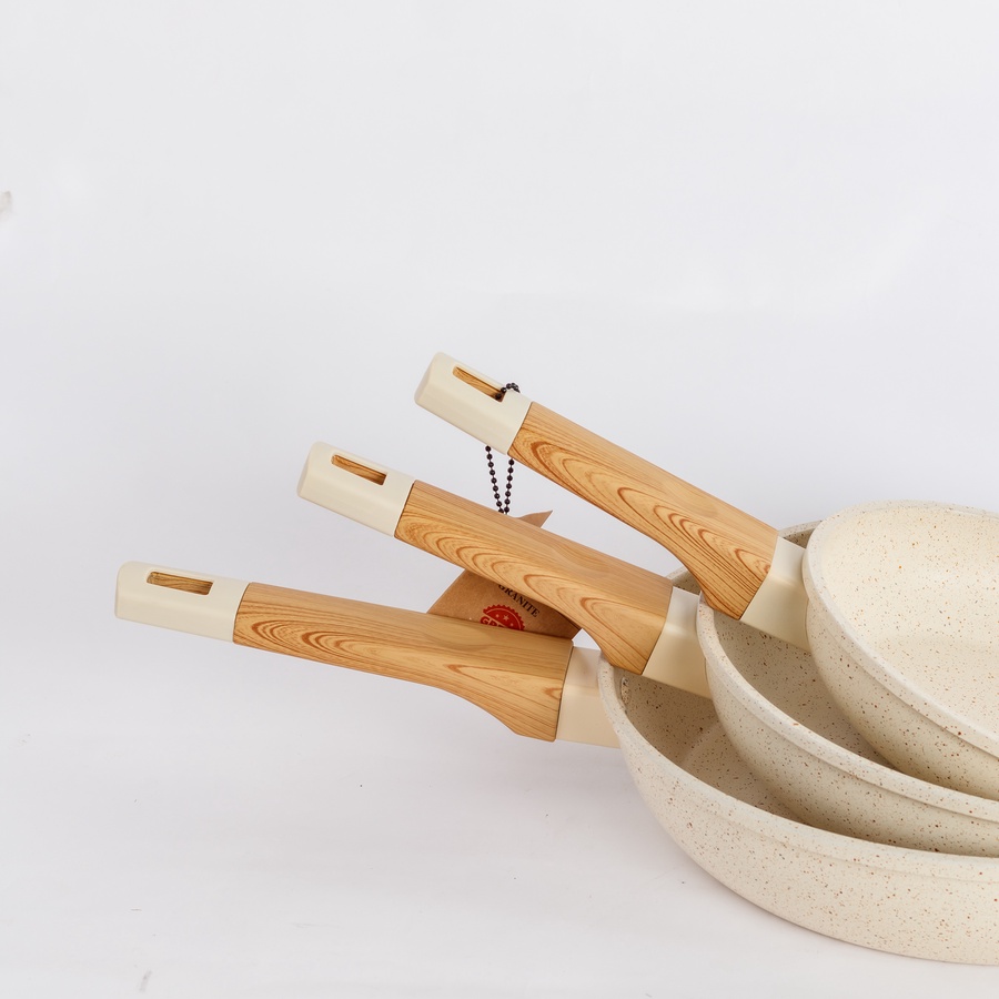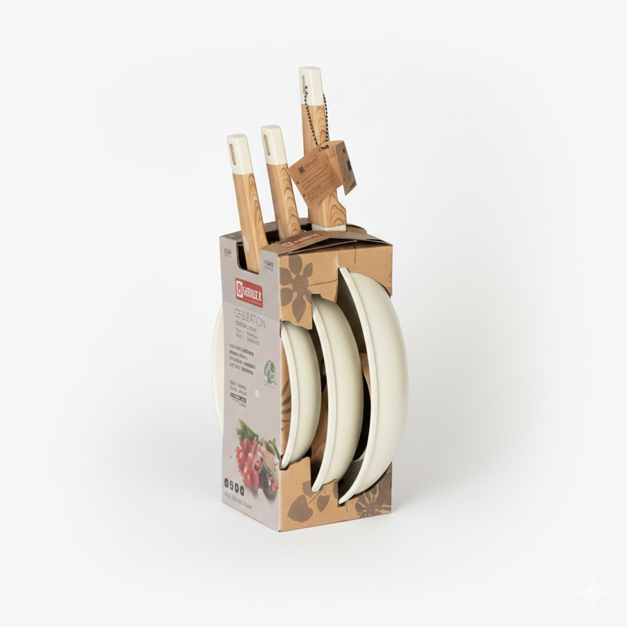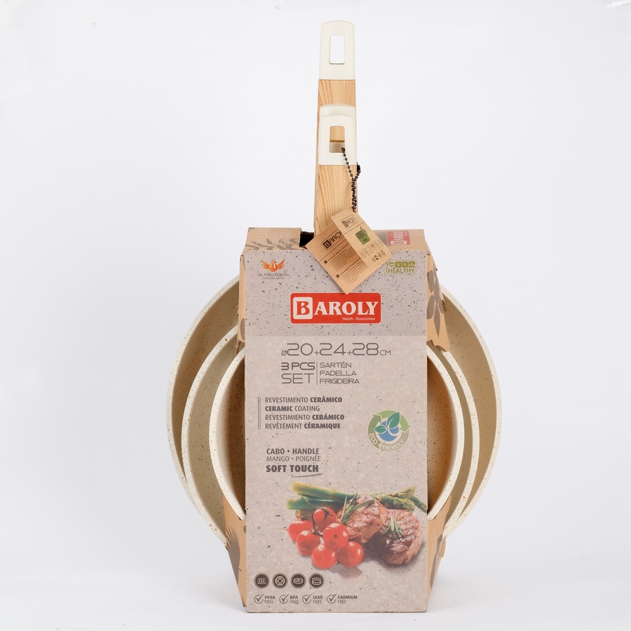 لمسة دفء ورقي لمطبخك مع طقم طاسات Baroly البيج، 3 مقاسات، طلاء سيراميك Non-Stick عملي وسهل التنظيف.
