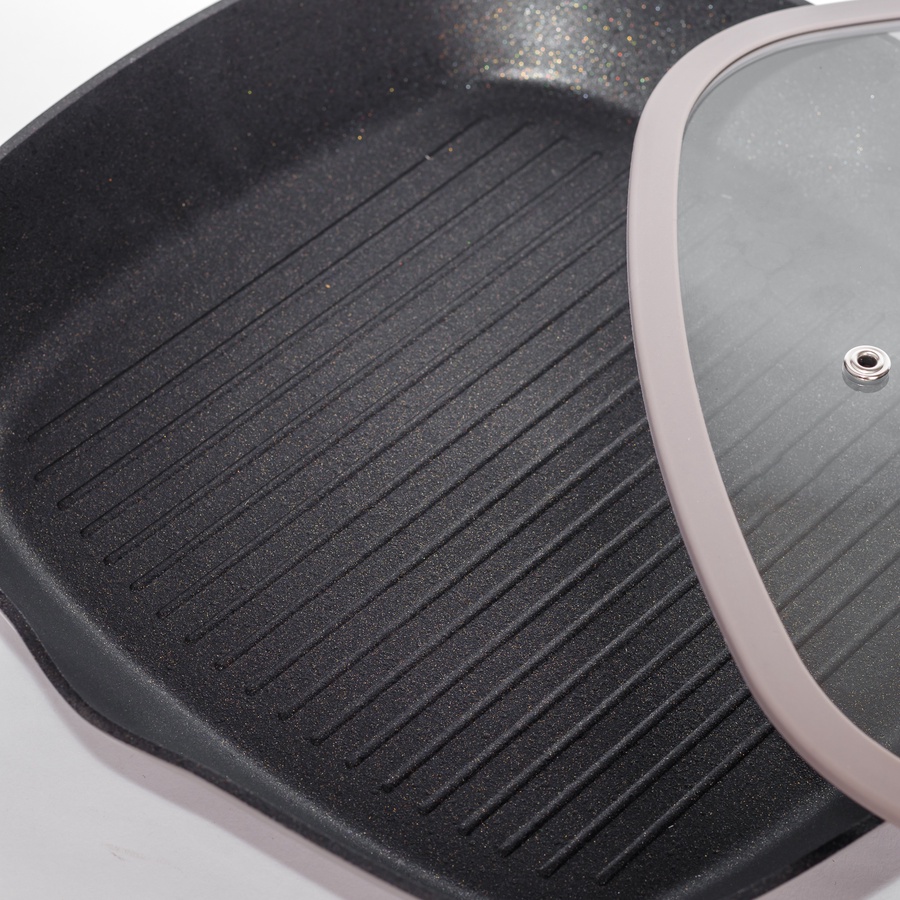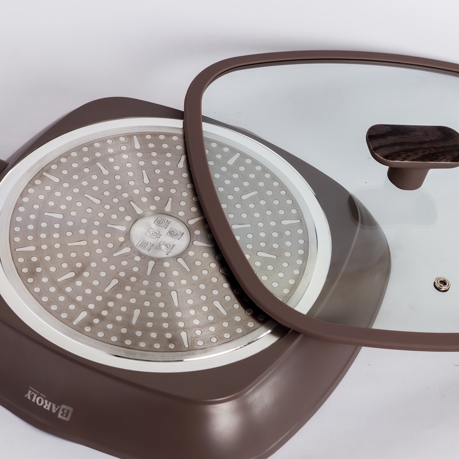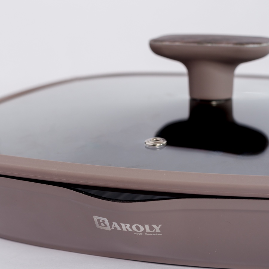 جريل الشوي من Baroly بخامة جرانيت قوية وتصميم عملي بغطاء بايركس شفاف لمتابعة الأكل بسهولة.