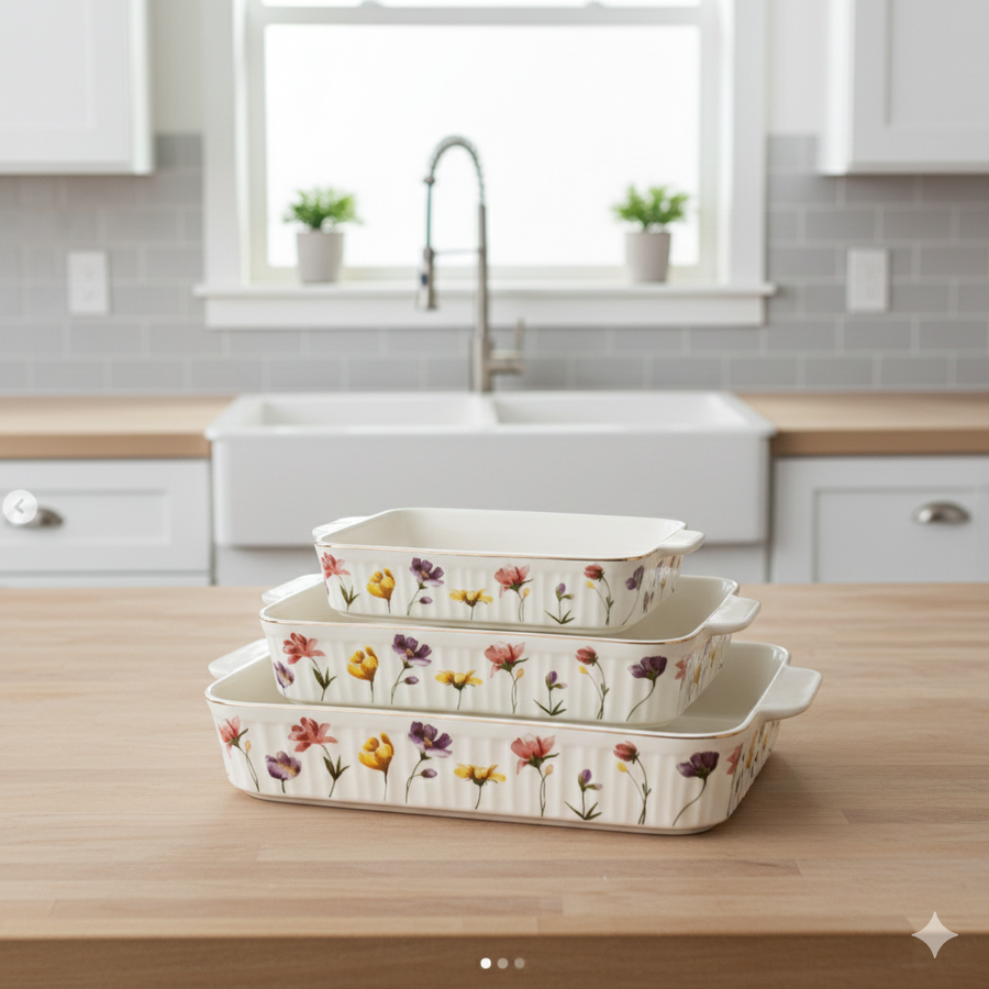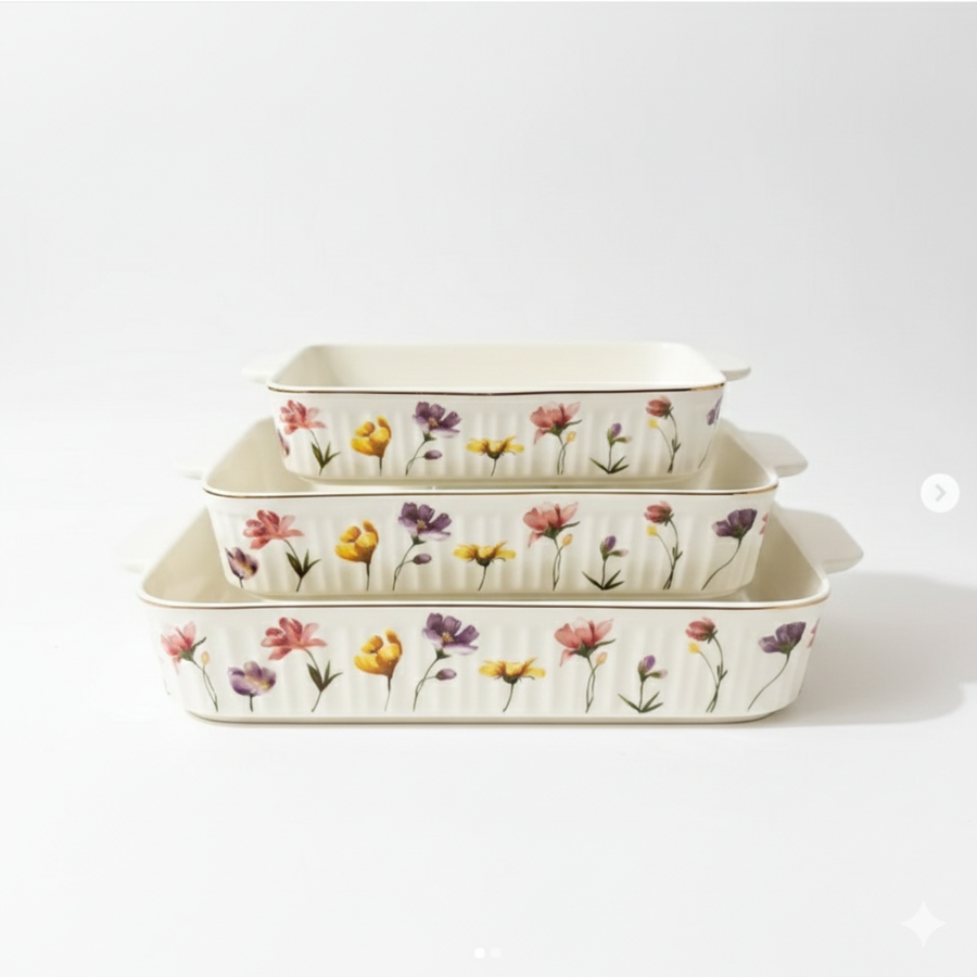 طقم صواني البورسلين الحراري 3 قطع بتصميم زهور رقيق يضيف لمسة فخامة على سفرتك ومطبخك. مثالي لتحضير وتقديم الأكل داخل الفرن أو مباشرة على السفرة.