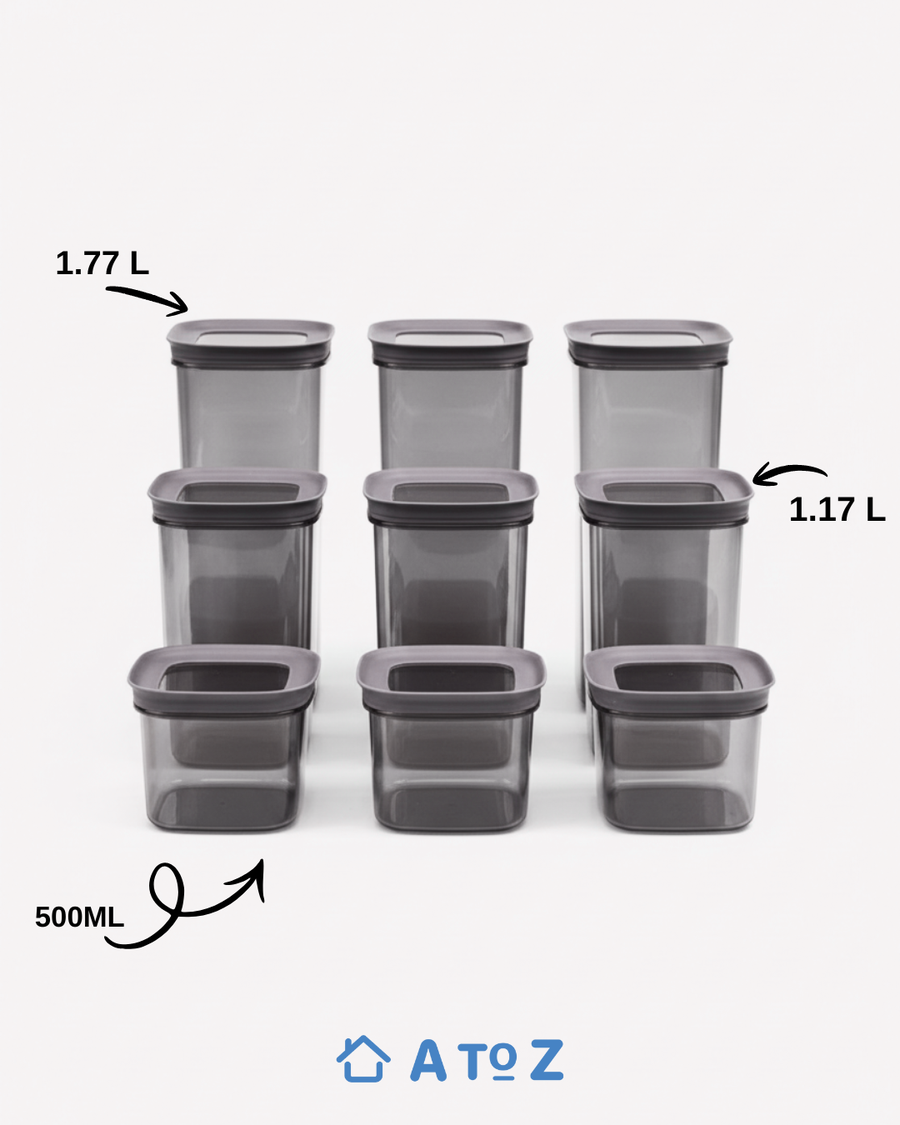 طقم علب تخزين عملي وأنيق من AtoZ، مصمم خصيصًا لتنظيم الثلاجة والمطبخ بطريقة صحية ومرتبة. الطقم مكوّن من 9 قطع بأحجام مختلفة لتناسب حفظ الخضار، الفاكهة، بواقي الطعام، والبقوليات بكل سهولة.