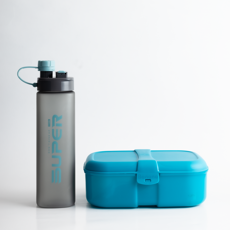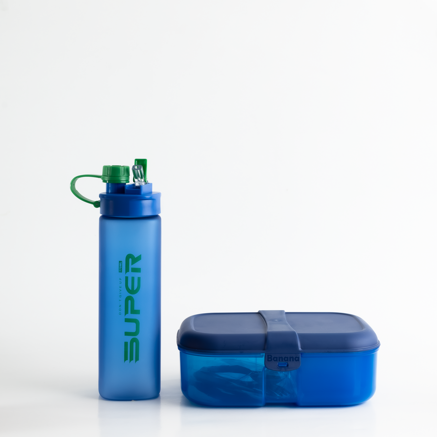 عرض Back to School من AtoZ: زجاجة مياه 2 لتر بألوان مبهجة + لنش بوكس بنانا 1.8 لتر + طقم شوك أطفال هدية. عملي وأنيق لبداية دراسية مميزة.