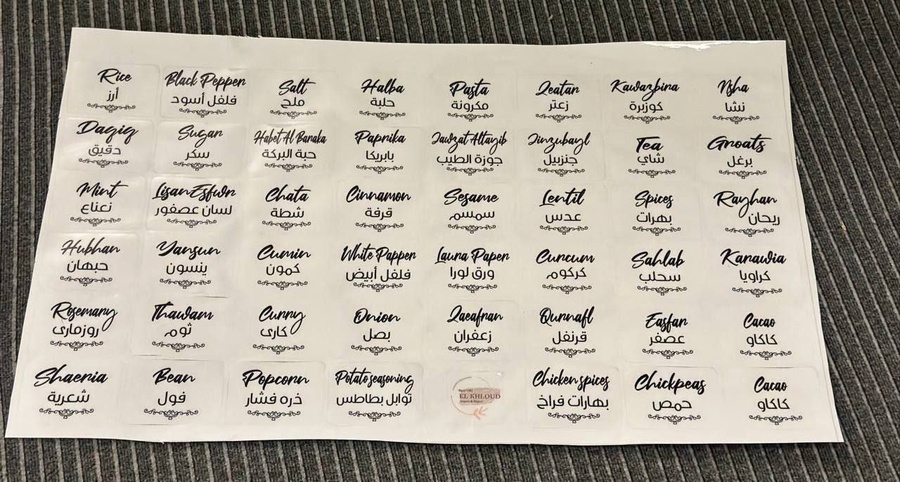 استيكر توابل شفاف بلاستيك عالي الجودة، مصنوع من خامة إسباني ممتازة بطباعة ثابتة مقاومة للمياه والقطع، لضمان الاستخدام طويل الأمد بدون بهتان أو تلف.