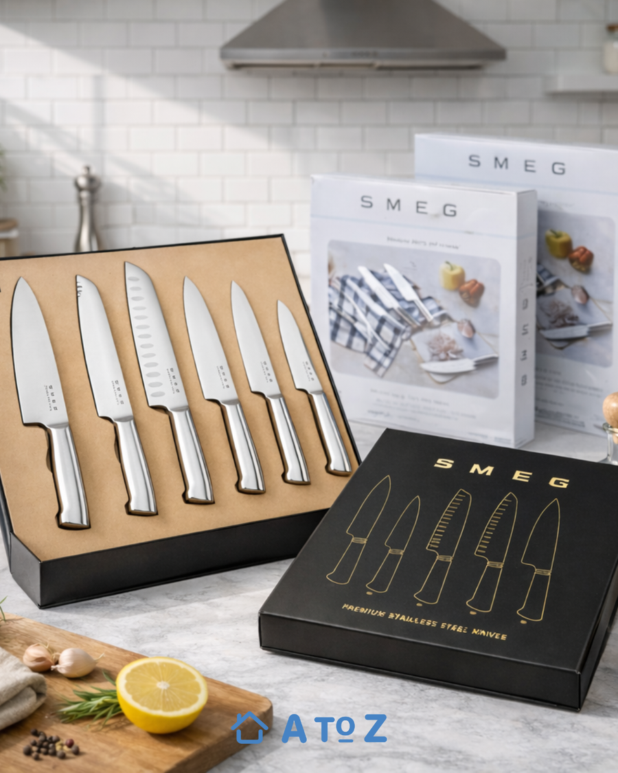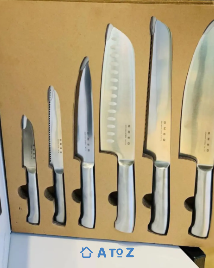 طقم سكاكين SMEG الإيطالي 6 قطع من AtoZ، مصنوع من ستانلس ستيل عالي الجودة، تصميم أنيق، حدة قوية، مناسب لكل استخدامات المطبخ والهدايا.