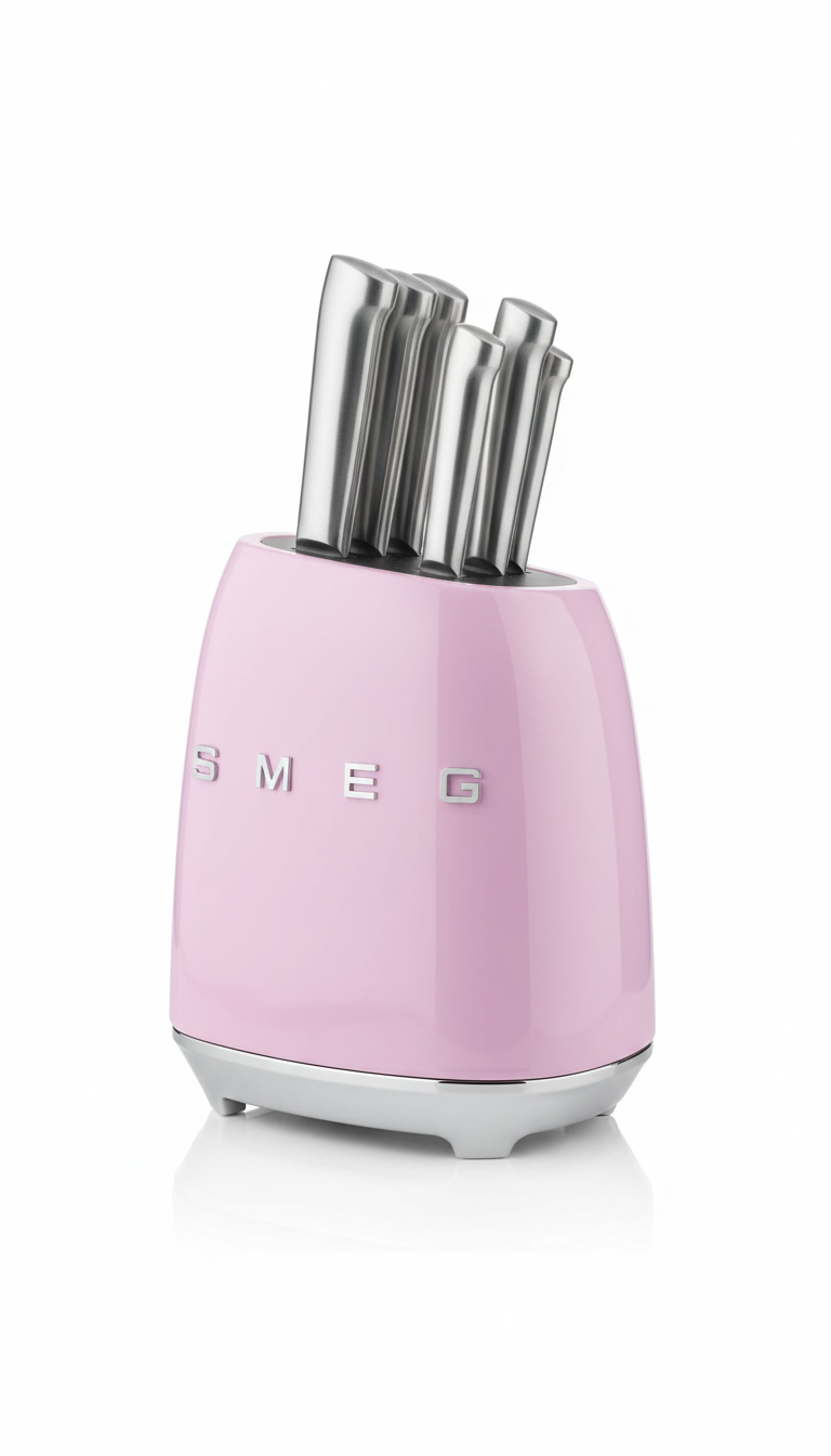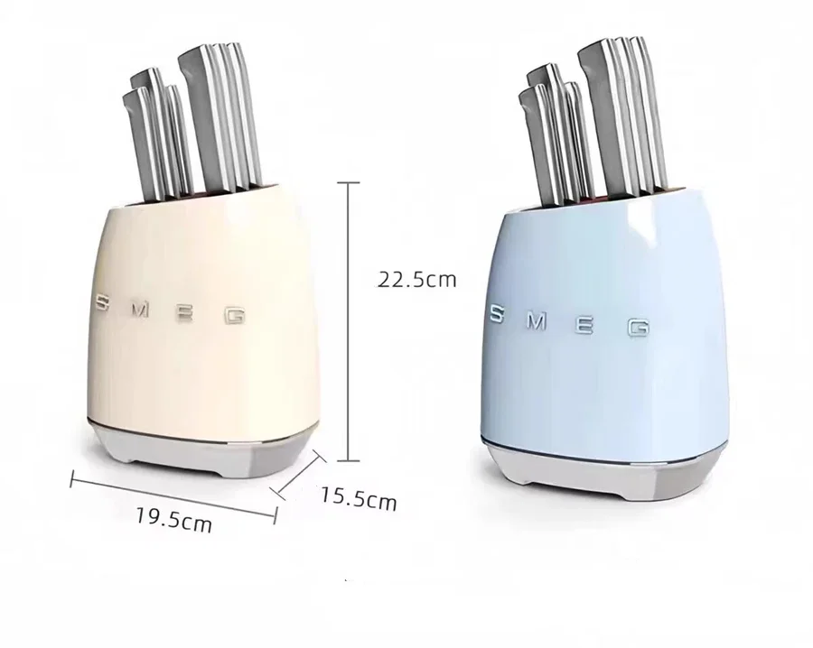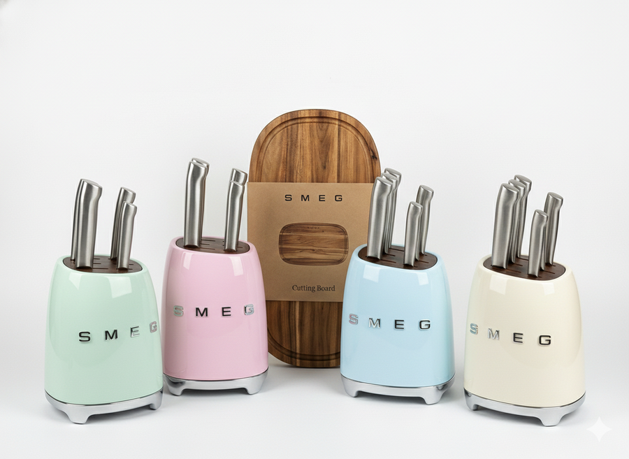 طقم سكاكين SMEG الإيطالي 7 قطع مع حامل أنيق من الستانلس ستيل عالي الجودة. تصميم عصري لمطبخك مع قطاعه بامبو هدية من AtoZ. مثالي للتقطيع وتحضير الطعام بسهولة.