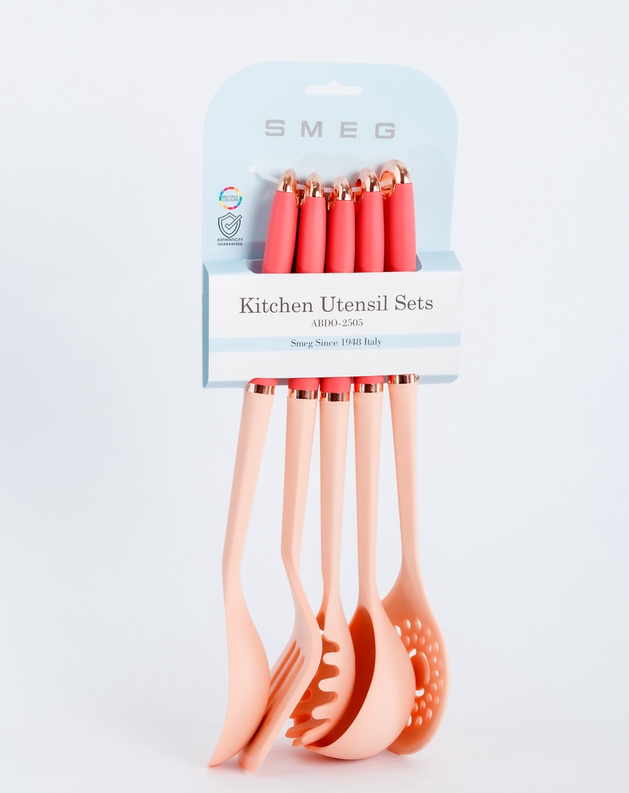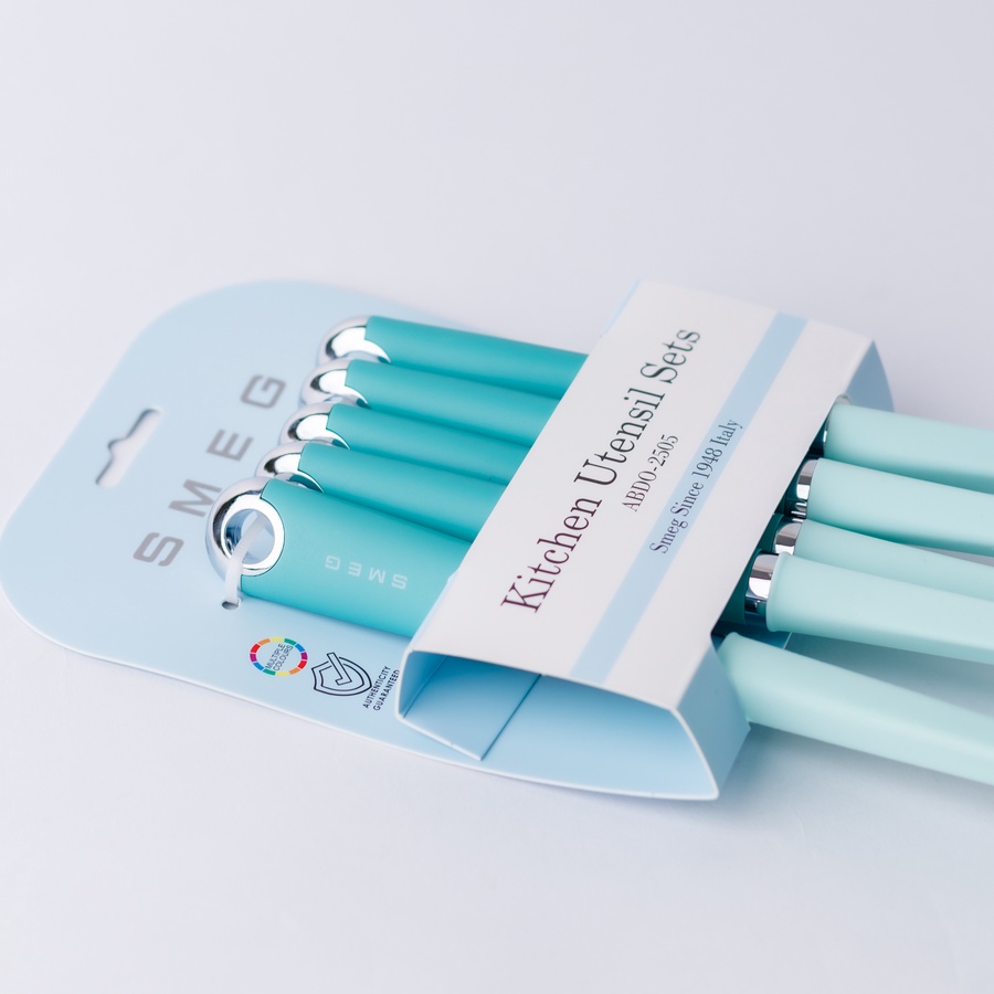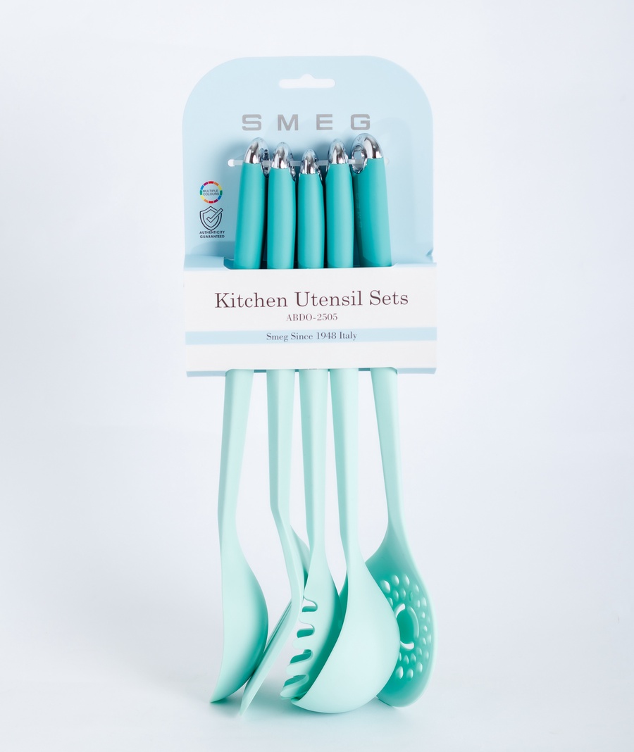 طقم أدوات المطبخ من SMEG هو الاختيار المثالي لكل مطبخ عصري. تصميم أنيق بألوان هادئة مع خامة سيليكون عالية الجودة تتحمل الحرارة وتحافظ على أوانيك بدون خدش.