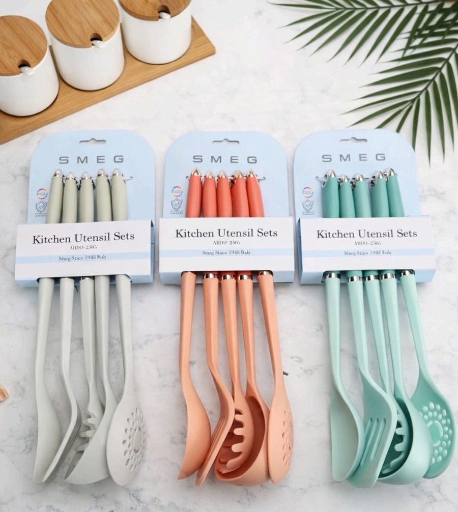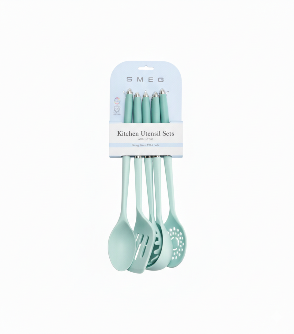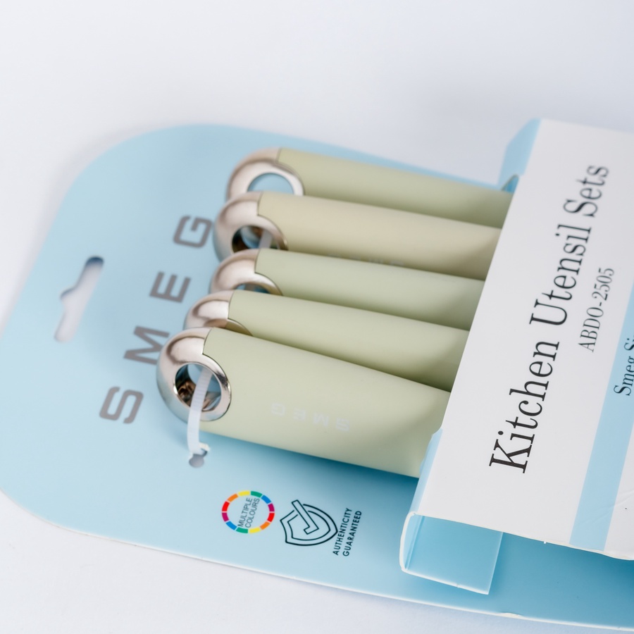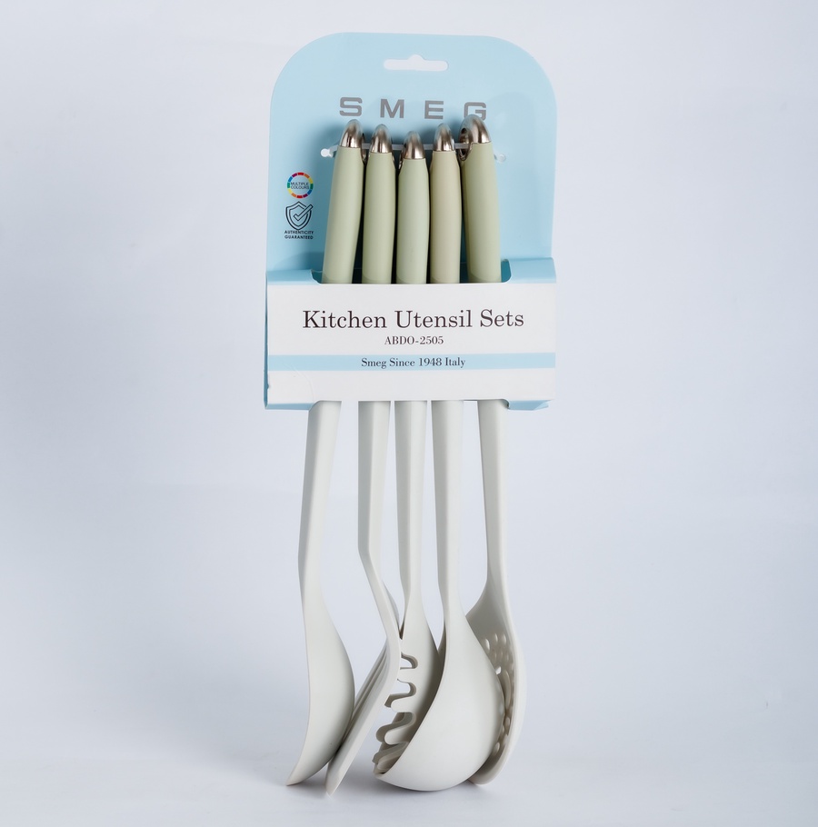 طقم أدوات المطبخ من SMEG هو الاختيار المثالي لكل مطبخ عصري. تصميم أنيق بألوان هادئة مع خامة سيليكون عالية الجودة تتحمل الحرارة وتحافظ على أوانيك بدون خدش.
