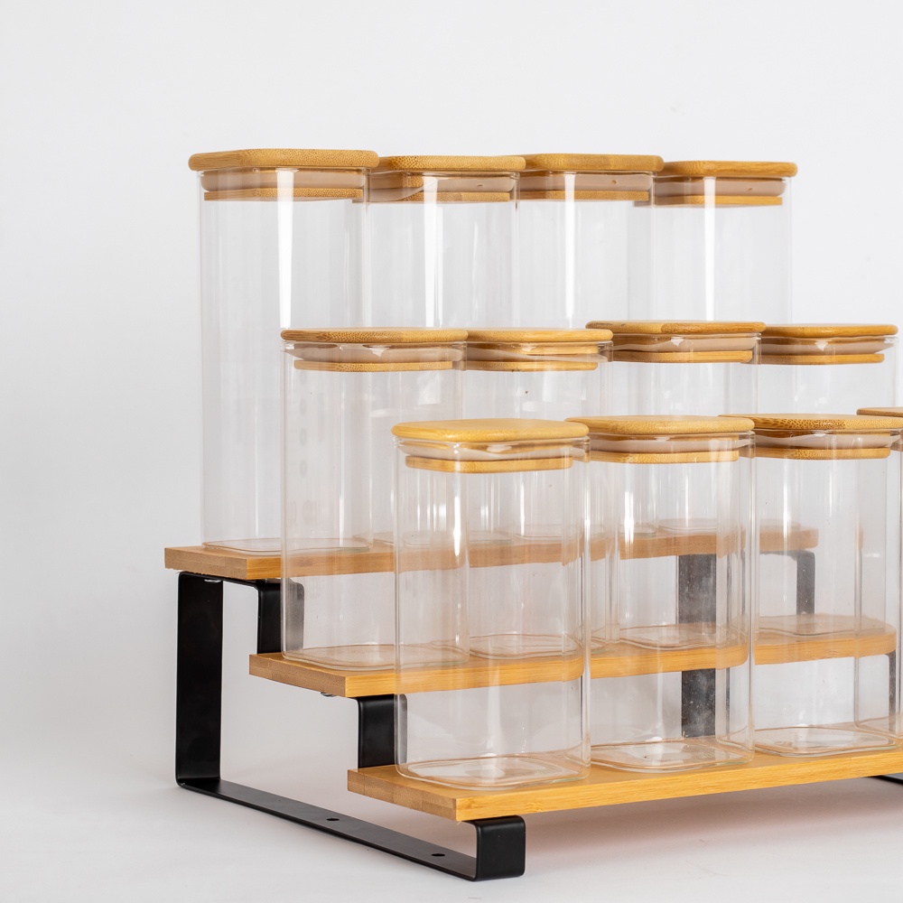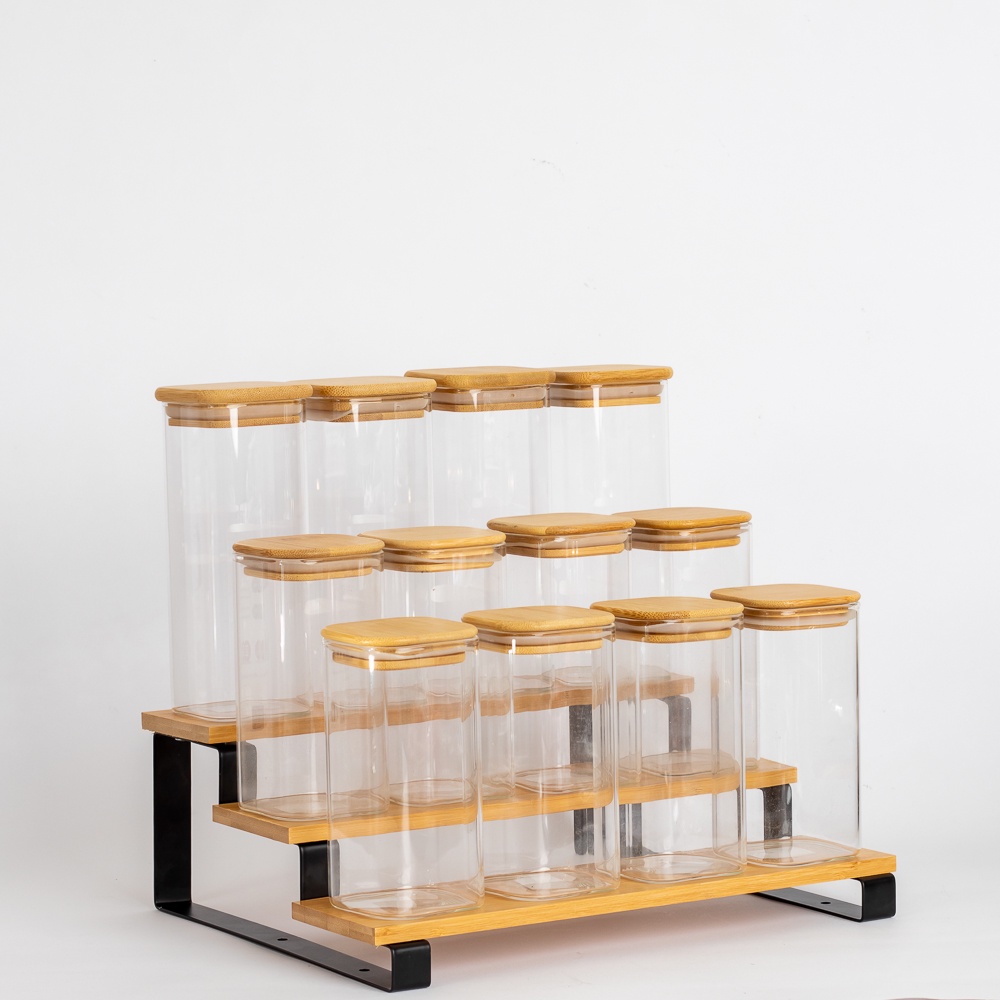 طقم توابل 12 قطعة من ATOZ ببرطمانات زجاج وأغطية بامبو على سلم عرض أنيق مع استيكر هدية. تصميم عصري يجمع بين الأناقة والتنظيم.